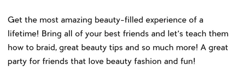 We are so happy we were able to make your birthday wish come true . Now you are a business owner that specializes in hair and nail services and get to work with all your friends . All of your friends leave with your very own hair product line .
