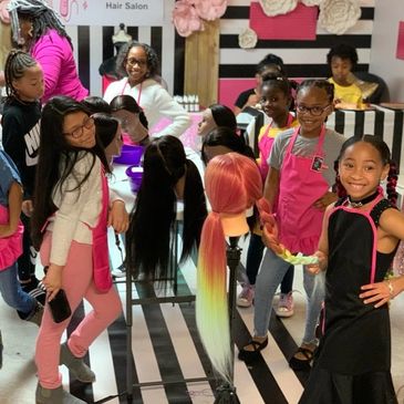 Every Stylist will learn all about the beauty industry styles and trends. They will learn hair braiding and how we do endtensions ....ponytails styles and nail design and painting... we have so much for them to learn. Each child goes home with a salon goodie bag from your child's hair product line 👑